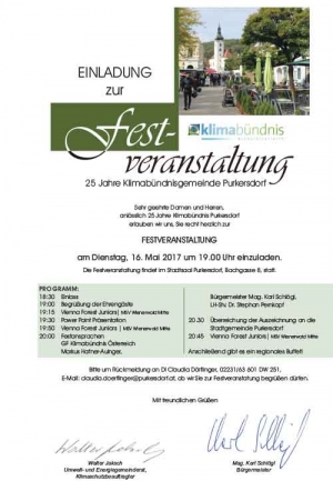 Purkersdorf ist seit 25 Jahren Klimabündnis-Gemeinde. Die jüngste Studie zur enormen Gesundheitsbelastung durch Dieselautos zeigt vor allem eines: Es ist höchst an der Zeit auch im Bezug auf diese "globalen" Themen regional zu Handeln. Feiern wir die ersten 25 Jahre Klimabündnisgemeinde gebührend und machen wir in den kommenden Jahren mehr draus.