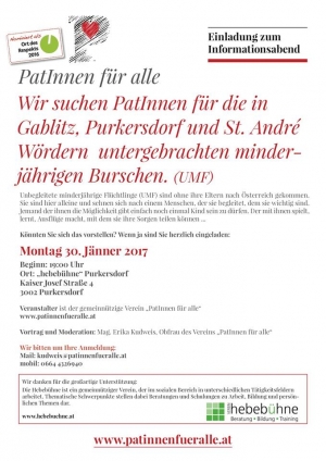 Wir suchen Patinnen und Paten für die in Gablitz, Purkersdorf und St. Andrä Wördern untergebrachten minderjährigen Burschen (UMF)