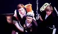 Mehr als zwei Dutzend Instrumente auf der Bühne, aber nur drei Musiker: David Helbock beschränkt sich weitgehend auf solche mit Tasten. Vogelwild die beiden unter anderem am Salzburger Mozarteum ausgebildeten Bläser. Johannes Bär ist fürs Blech zuständig, von Trompete über Bassflügelhorn bis zu hin zu Alphorn und Tuba. Andreas Broger spielt die Holzblasinstrumente: Saxophone, Klarinetten, Flöte.